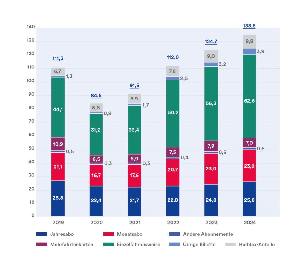 Der Tarifverbund Passepartout konnte im Jahr 2024 seinen Umsatz signifikant steigern. Gegenüber dem Vorjahr resultierte ein Plus von 9 Millionen Franken, was einer Zunahme von 7,2 Prozent entspricht. Auch das Umsatzziel wurde mit einem Überschuss von 6,6 Millionen Franken (+5,2 Prozent) übertroffen. Die Tarif und Sortimentsanpassungen per 10. Dezember 2023 haben wesentlich zur positiven Entwicklung beigetragen.